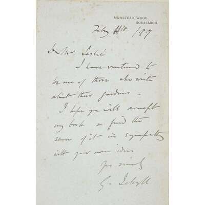 London: Longmans, Green and Co., 1899. First edition. 8vo. Presentation copy to the English painter George D(unlap) Leslie, from his library and with his book-plate mounted to the interior A.L.s leaf on the front paste-down. With two Jekyll autograph letters, signed to Leslie mounted to front paste-down and endpaper. Illustrated with frontispiece and photo-plates. Foxing to endpapers, small tape residue on front blanks. Publisher's blue cloth; stamped in gilt; edges untimmed, slightly shaken, spine faded, joints frayed, edges lightly worn, covers slightly scuffed. .