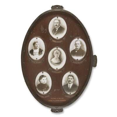 Ca. 1920s. Six photographs of Fridenberg family members printed on porcelain and mounted on oval bronze plaque, with stamped text.