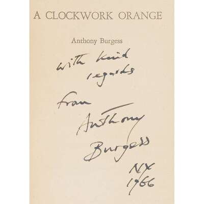 New York: Ballantine Books, (1965). First U.S. paperback printing. 12mo. Inscribed, dated, and signed in ink on the title-page by Burgess, "With kind/ regards/ from/ Anthony/ Burgess/ NY/ 1966." Original stiff color pictorial wrappers. Wrappers very lightly worn, corners slightly bumped, lightly toned; text moderately toned.