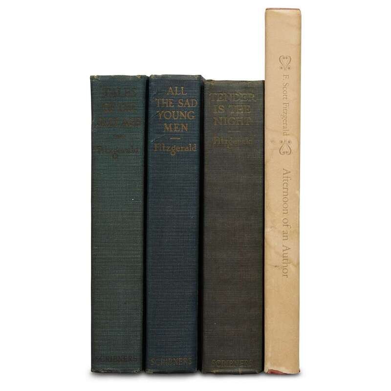 Tales of the Jazz Age New York: Charles Scribner's Sons, 1922. First edition. 8vo. 317 pp. Publisher's blue-green cloth; lacking dust-jacket. Corners very lightly bumped, small tide mark to rear cover fore-edge, gilt lettering on spine faded; ownership signature on front paste-down, text lightly toned. Bruccoli A 9.1.a All the Sad Young Men New York: Charles Scribner's Sons, 1926. First edition. 8vo. 267 pp. Publisher's blue-green cloth; lacking dust-jacket. Manuscript notation in pencil on contents page, as well as pp. 5, 90, and 170, some small paper loss to the fore-edge of p. 5, text lightly toned. Bruccoli A 12.1.a Tender is the Night, A Romance New York: Charles Scribner's Sons, 1934. First edition. 8vo. 408 pp. Publisher's blue-green cloth; lacking dust-jacket. Corners and edges very lightly worn; ownership signature on front free endpaper, unopened at dedication and half-title, text lightly toned, scattered light foxing to same. Bruccoli A 14.1.a Afternoon of an Author, a Selection of Uncollected Stories and Essays Princeton: Princeton University Library, 1957. First edition. Tall 8vo. Publisher's red cloth; in grey paper dust-jacket, toned, tide marks to spine; text clean and bright. Bruccoli A 22.1.a .