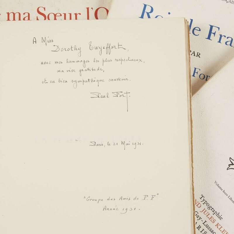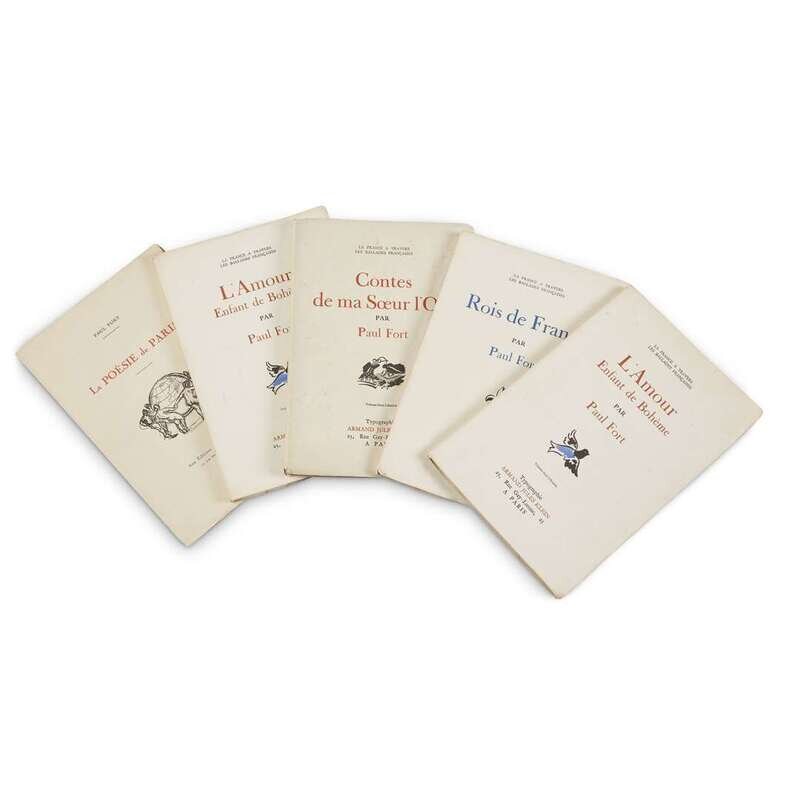 Including: L' Amour enfant de boheme Paris: Armand Jules Klein, (1930). Limited edition #59/200 (of 500) numbered copies. 4to. Presentation copy signed by Fort with etched frontispiece by Ignacio Zuloaga and other illustrations by Gino Severini. Original wrappers. L' Amour enfant de boheme #177/200 (of 500) of the preceding in original wrappers. Presentation copy signed by Fort on front blank. La Poesie de Paris Paris: Editions de la Marjolaine, (1930). Limited edition #93/200 (of 600) numbered copies. 4to. Presentation copy signed by Fort on front blank and illustrated by Paul Velsch. Original wrappers. Rois de France Paris: Armand Jules Klein, (1931). Limited edition #103/ 200 (of 330) numbered copies. 4to. Presentation copy signed by Fort with engraved frontispiece by Severini. Original wrappers. Contes de ma Soeur l'Oie Paris: Armand Jules Klein, (1931). Exemplaire de Madame Dorothy Twyeffort Hubbell, # 57/200 (of 330) numbered copies. 4to. Presentation copy signed by Fort on front blank with lithographic frontispiece portrait by Severini. Original wrappers, binding broken. All in blue cloth fall-down-back box. .