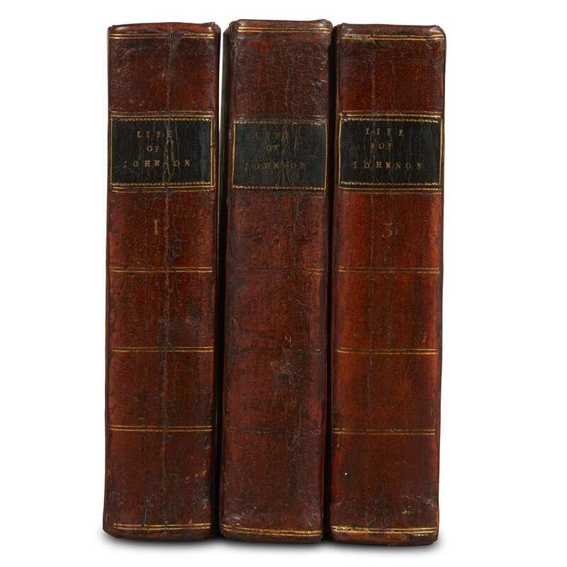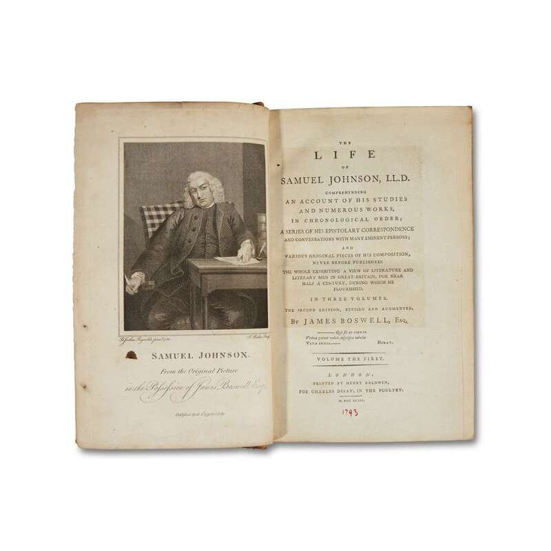 ... ersons; and Various Original Pieces of his Compositions, Never Before Published… London: Harry Baldwin for Charles Dilly, 1793. Second Edition, “revised and augmented.” 8vo. Illustrated with engraved frontispiece portrait of Johnson and two engraved folding plates. With the inserted leaf of Additional Corrections and the “Chronological Catalogue of the Prose Works of Samuel Johnson” in the first volume. Contemporary brown calf; black morocco spine labels; restored. Some dampstaining and paper losses to edges of endpapers; manuscript date at bottom of title-page in the first volume; one leaf repaired; pp. 235 with mounted leaf in the first volume. ESTC T64482, [ Pottle 81], [ Rothschild 468].