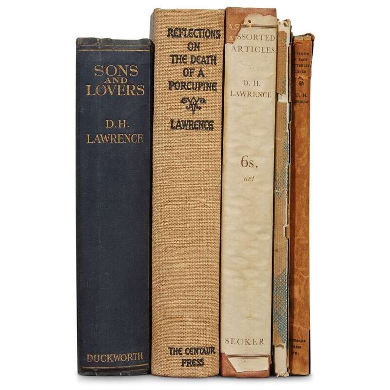 Sons and Lovers London: Duckworth & Co., 1913. First edition. 8vo. 423 pp. plus [20] pp. of advertisements. With dated cancel title-page tipped in. Publisher's blue cloth, corners bumped, spine sunned; lettered in gilt; in later hand-made white dust-jacket; previous dealers manuscript receipt laid in at front, text lightly toned, some soiling to the fore-edge of pp.238-260, hinge starting to crack at beginning of advertisements. Roberts A4 1 Reflections on the Death of a Porcupine and Other Essays Philadelphia: The Centaur Press, 1928. First and limited edition, #637/925 numbered copies. 8vo.240 pp. Original one-quarter natural linen and marbled boards, lettered in black on spine, top edge stained blue and trimmed, others untrimmed. Corners lightly bumped; text lightly toned. Roberts A32 Rawdon's Roof London: Elkin Mathews & Marrot, 1928. First and limited edition, #170/530 numbered copies. 8vo. 32 pp. Signed by Lawrence on limitation leaf. Grey and blue paper boards; in dust-jacket, worn and separated at front hinge, small chipping to corners and edges, crown and tail of spine worn; some offsetting on front paste-down and free endpaper, text lightly toned. Roberts A40 A Propos of Lady Chatterley's Lover being an essay extended from "My Skirmish with Jolly Rodger" London: Mandrake Press Ltd., 1930. First revised edition. [63] pp. Blue cloth; lettered and ruled in red; in orange dust-jacket,w orn, dampstaining to front and rear covers, tide mark to top edge, tears along top and bottom of jacket hinge; ownership signature in pencil on front free endpaper, text very lightly toned. Roberts A48b. Assorted Articles London: Martine Secker, 1930. First edition. [216] pp. Red cloth; lettered in gilt; in pictorial white and brown dust-jacket, worn, paper loss to corners and spine, other small closed tears; text lightly toned. Roberts A53 .
