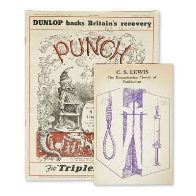 The Screwtape Letters London: Geoffrey Bles: The Centenary Press, 1942. Reprint. 160 pp. Blue cloth; in dust-jacket, lightly worn, minor edgewear, some light soiling; internally clean and bright. Perelandra London: John Lane The Bodley Head, 1943. Reprint. 256 pp. Blue cloth; in blue dust-jacket, worn, separated at rear fold, other tears and abrasions, corners bumped, slightly warped; foxing to edges, occasional foxing to text, lightly toned. Christian Behaviour London: Geoffrey Bles: The Centenary Press, 1943. First edition. 64 pp. Publisher's orange cloth; in dust-jacket. Small tears to edges, corners, and spine of dust-jacket; light toning to text, ownership signature in ink on front free endpaper. The Pilgrim's Regress London: Geoffrey Bles, 1943. Reprint. 199 pp. Green cloth; in dust-jacket, worn, toned, some small tears to edges; pictorial endpapers; very light toning to text. That Hideous Strength, a modern fairy-tale for grown-ups London: John Lane The Bodley Head, 1945. Second printing, war economy standard issue. 476 pp. Publisher's blue cloth; lacking dust-jacket. Lightly worn, corners bumped; ownership signature in ink on front paste-down, otherwise clean and bright. Punch Magazine England: Messrs. Bradbury, Agnew & Co. January 9, 1946, Vol. CCX No. 5479. 44 pp. Pictorial self-wrappers. Lightly worn, small closed tears to fore-edge; clean and bright. The Case for Christianity New York: The Macmillan Company, 1946. First American edition. 56 pp. Grey cloth; lettered in red; in dust-jacket, toned, some light abrasions to corners, light toning to text, occasional foxing to text and edges. Miracles, A Preliminary Study London: Geoffrey Bles. The Centenary Press, 1947. First edition. 220 pp. Green cloth; in dust-jacket, toned, moderately soiled, some chipping and tears to edges and corners; very light toning to text, occasional light foxing to text, light foxing to edges. Literature and Life, Addresses to the English Association London: George G. Harrap & Co. Ltd, 1948. First edition. Blue cloth; in dust-jacket, lightly worn, darkening to spine, closed tear to top edge; light toning to text, some off-setting to front and rear free endpapers. Transposition and other Addresses London: Geoffrey Bles, 1949. First edition. 64 pp. Stiff red paper boards; in dust-jacket, light edge-wear; light toning to text. English Literature in the Sixteenth Century Oxford: At the Clarendon Press, 1954. First edition. 696 pp. Blue cloth; in dust-jacket, toned, lightly worn; very light toning to text and edges. Studies in Words Cambridge: At the University Press, 1960. First edition. 240 pp. Blue cloth; in dust-jacket, very lightly worn; text very lightly toned. An Experiment in Criticism Cambridge: At the University Press, 1961. First edition. 143 pp. Red cloth; in dust-jacket, very lightly worn; text bright and clean. The Discarded Image Cambridge: At the University Press, 1964. First edition. 232 pp. Blue cloth; in dust-jacket, lightly toned; text bright and clean. Letters to Malcolm Chiefly in Prayer London: Geoffrey Bles, 1964. First edition. 159 pp. Green cloth; in dust-jacket, lightly toned, small tear to top edge; very light toning to text. Of Other Worlds. Essays and Stories London: Geoffrey Bles, 1966. First edition. 148 pp. Orange cloth; in dust-jacket, lightly worn, lightly toned; text clean and bright. Christian Reflections Michigan: William B. Eerdmans Publishing Company, 1967. First edition. Blue cloth; in dust-jacket, worn, toned, some small chips and abrasions to edges, tear to the top edge of the rear flap; text clean and bright. The Humanitarian Theory of Punishment Marcham Manor Press, [1972]. 4 ll. Limp pictorial wrappers. Toned, front leaf slightly creased; text moderately toned. .