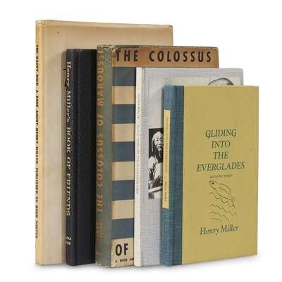 The Colossus of Maroussi San Francisco: The Colt Press, (1941). First trade edition. 8vo. Book-plate of Henry Kurth (possibly the theaterlighting and set designer) on front free endpaper. Blue cloth; in dust-jacket; paper spine label. Small chips to joints and edges of dust-jacket, discoloration and slight dampstains to rear panel of same, moderate wear to joints and edges of cloth, some dampstains to same; book-plate offset onto front paste-down and dust-jacket flap, slight discoloration to endpapers, text slightly toned at edges. Reflections on the Maurizius Case Santa Barbara: Capra Press, 1974. First and limited edition, #53/275 numbered copies and signed by Miller on the limitation page. 8vo. Original gilt-lettered grey cloth, pictorial cover label. Lightly worn. Henry Miller’s Book of Friends Santa Barbara: Capra Press, 1976. First and limited edition, #58/250 numbered copies and signed by Miller on the limitation page. 8vo. With photo illustrations. Original black leatherette; gilt-lettered spine; in acetate dust-jacket. Near Fine. Gliding into the Everglades and other essays [Santa Barbara]: Lost Pleiade Press, 1977. First and limited edition, #234/250 numbered copies and signed by Miller on the limitation page. 12mo. Original blue-cloth-backed pictorial mustard boards; lettered in green; lacking acetate dust-jacket. Lightly worn; internally clean. (Porter, Bern), publisher The Happy Rock: A Book about Henry Miller (Berkeley: Packard Press), (1945). Second issue, out-of-series copy. 4to. Ferdnand Leger-designed quarter grey cloth over pictorial boards; in Abraham Rattner-designed dust-jacket. Printed on variously colored papers. Contributions by Lawrence Durrell, William Carlos Williams, and others. Light edge wear, dust-jacket moderately toned, occasional small chips to same; ownership signature front free endpaper, text bright.
