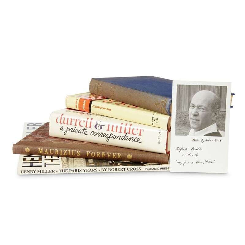 Maurizius Forever San Francisco: The Colt Press, 1946. First edition. Unnumbered copy of 500 printed at the Grabhorn Press. Illustrated after watercolors by Henry Miller. Original brown cloth-backed patterned boards, gilt-lettered spine, rough cut edges. Bright, attractive copy. Perles, Alfred. My Friend Henry Miller London: Neville Spearman, (1955). First edition. 8vo. Presentation copy to James L. Reinhardt with mounted label on front free endpaper signed by Henry Perles and Henry Miller. Additionally initialed and dated below the label by Miller. With post card signed by Miller relating to the availability of this publication inserted at front. With frontispiece and photo plates. Original blue cloth, gilt-lettered spine. Lightly worn, slightly dusty; frontispiece loose, scattered notation in pencil in margins, text lightly toned. [Wickes, George], editor Lawrence Durrell [&] Henry Miller, A Private Correspondence New York: E. P. Dutton & Co., Inc., 1963. First edition. 8vo. Advance Review copy with the publisher’s printed slip inserted. Red cloth; lettered in gilt; in dust-jacket. Light edge wear, dust-jacket with small chips and light creases at edges, scattered minor notation in pencil in margins, otherwise bright and clean. Dick, Kenneth C. Henry Miller, colossus of one The Netherlands: Alberts-Sittard, 1967. First and limited edition, #191/1,100 numbered copies signed by Kenneth C. Dick on the limitation page. 8vo. Brown cloth; lettered in gilt; in dust-jacket. Minor wear, small chips a tears to dust-jacket; internally clean. Cross, Robert Henry Miller, The Paris Years (Big Sur: Peeramid Press), (1991). Small oblong folio. Original photo-pictorial stiff wrappers. Inscribed and signed by Cross and the book’s designer Jerry Kamstra on front blank. Photos and other illustrations. Near Fine.