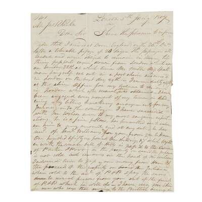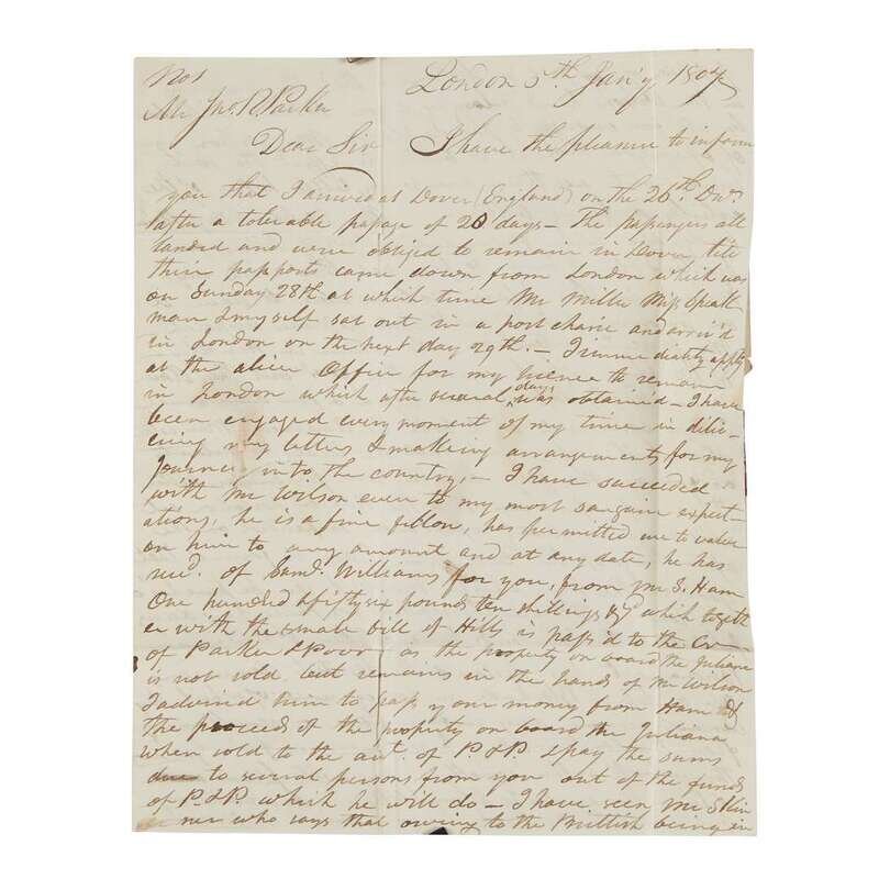 London, January 5, 1807. 4to. 2pp. Relating to Jay's Treaty of 1794 from Moses Poor to John R. Parker of Messrs. Parker and Poor were merchants of Boston. Poor is here describing his Journey to Dover, his application to the Aliens Office for his license and his pursuit of business contacts, "...In the ship which carries this goes out the American Treaty which was sign'd a few days since. I have conversed with both the American Minister & Counsel. They assure me that the treaty is certainly as good as Mr. Jay's..."