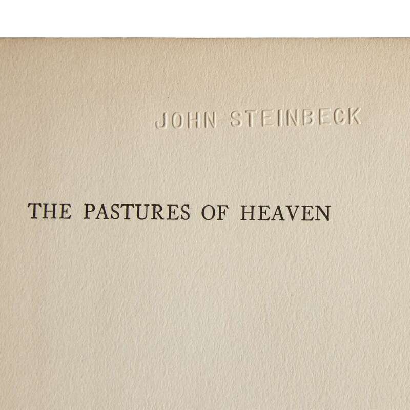 New York: Brewer, Warren, & Putnam, 1932. First edition. 8vo. From Steinbeck's library, with his name in his customary embossed stamp on half-title. Signed by one of his three wives as "Mrs. Steinbeck" in pencil on the first free endpaper. Publishers green cloth, spine and extremities sunned; stamped in gilt; top edge stained; lacking dust-jacket; text lightly toned. [Goldstone & Payne A2a] Steinbeck's second novel of 12 interconnecting stories set in Monterey, California. .