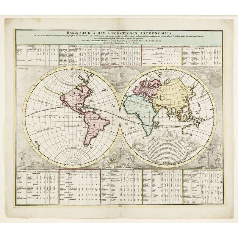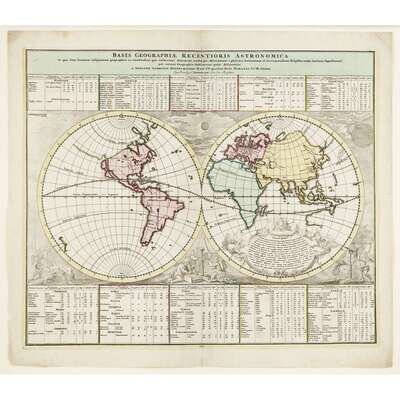[Map] 1 Piece. Engraved hand colored double hemisphere World Map. Homann, Johann Baptist after Dopplemayr, Johann Gabriel. "Basis Geographiae Astronomica." Nuremberg, (ca. 1730). 19 1/2 x 23 1/4 inches; 495 x 590 mm, margins. Lightly toned, minor matburn, some darkening and small chipping in blank margins. Body of map generally clean. Later color. Showing California as an island. Expertly top hinge mounted to mat.