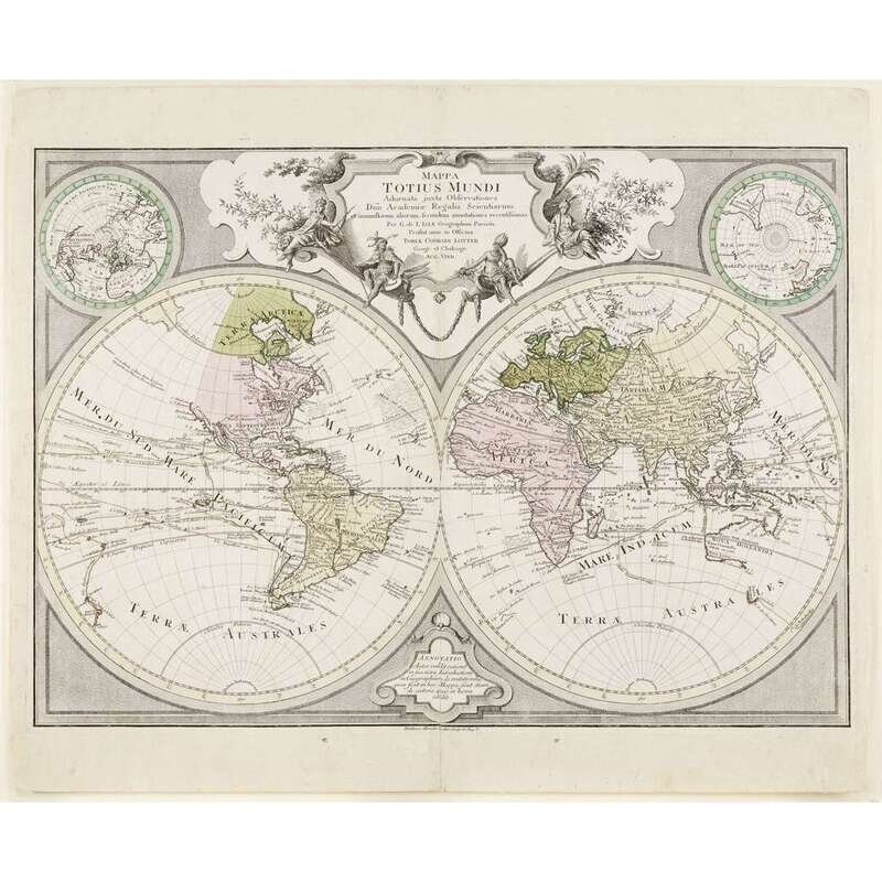 Lotter, Tobias Conrad after Guillaume de L'Isle Mappa totius mundi… (Augsburg), (ca. 1770). Engraved partly hand-colored map. 18 x 25 ¾ in., (460 x 654 mm) (margins). Later hand-coloring; spotting in margins. Mounted to mat. Homann, Johann Baptist after Dopplemayr, Johann Gabriel Basis Geographiae Astronomica Nuremberg, (ca. 1730). Engraved partly hand-colored map. 19 ½ x 23 ¼ in., (495 x 590 mm) (margins). Showing California as an island; later hand-coloring; lightly toned; minor mat-burn; some darkening and chipping in margins. Mounted to mat.