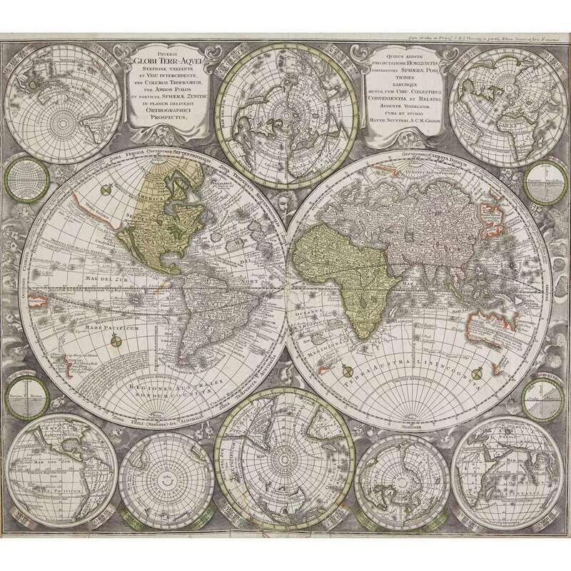 Engraved world map with partial hand-color [Augsburg, ca. 1730-1744]. 20 x 22 ½ inches; 505 x 570mm. Narrow margins, edges of verso taped to mat, a few old printed paper scraps mounted to verso; lightly and evenly toned, a few pin-hole size brakes in surface, later partial color. Shirley 578 .