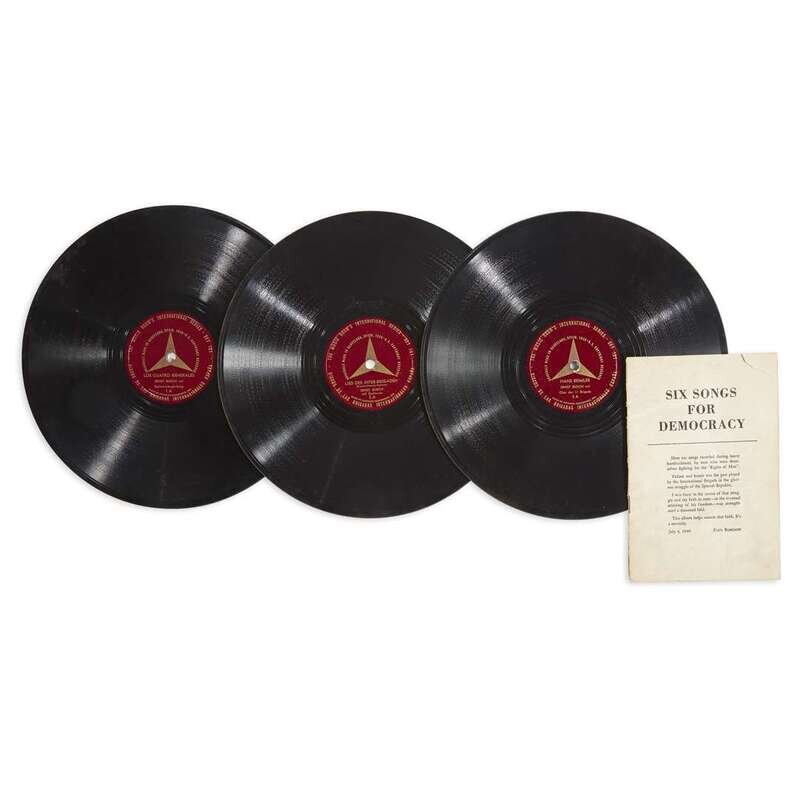(New York): (Music Room), (ca. 1940’s). Three 78 rpm discs. Oblong 4to. Songs by Busch, masters supplied by Robeson. Including the 12mo pamphlet featuring lyrics and notes by Robeson, Erich Weinert, and Eric Bernay; different printing than the other lot offered, lightly worn and soiled, small loss to rear wrapper. Black and red spine over black and brown boards, worn, front board separated and crudely repaired with tape; sleeves affected by damp, discs not played; labels different than other lot offered.