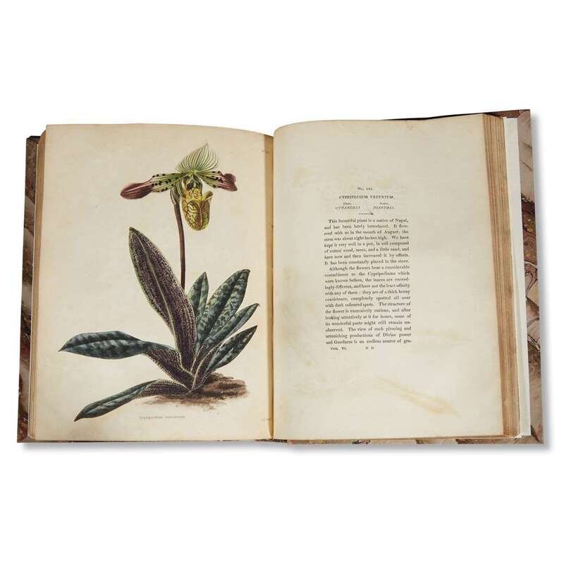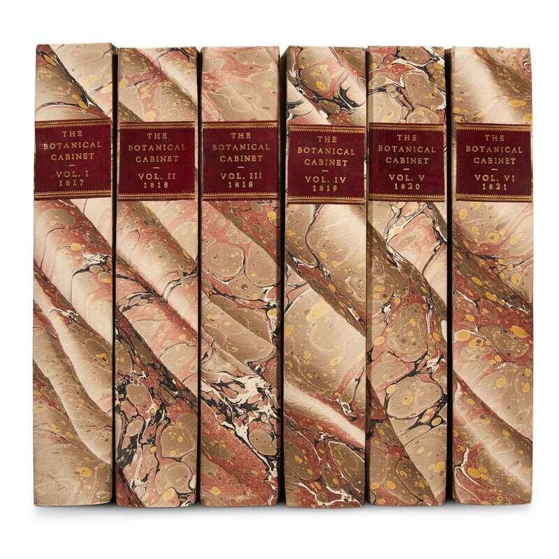 London: Conran Loddiges & Sons, 1817-1821. In six volumes. Volumes I-VI (of 20). 4to. Modern marbled board; maroon morocco spine labels; marbled edges; minor wear. Illustrated with six engraved title-pages, 599 (of 600) hand-colored engraved plates, and two black and white engraved plates; with the Index at the back of each volume; with the armorial 19th century book-plate of William Turner re-mounted on the new paste-downs. In six volumes.