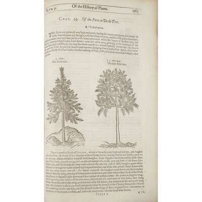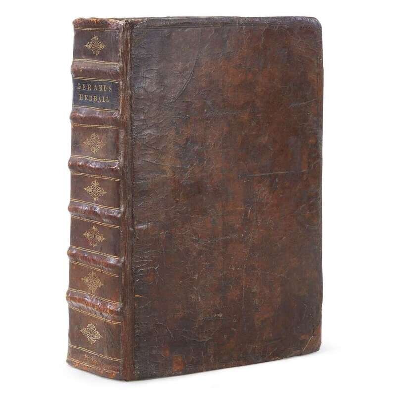 London: Adam Islip, Joyce Norton, and Richard Whitakers, 1633. Second edition. Folio. [38], 1-1630, [48]pp. Old calf, repaired and rebacked; spine in gilt; morocco spine label; new endpapers; in black and grey cloth fall-down-back box. Illustrated with an engraved title-page and 2,766 botanical woodcuts in text; some creasing and dampstaining, engraved title-page repaired and mounted on heavy paper, lacking front and rear blanks. STC 11751.