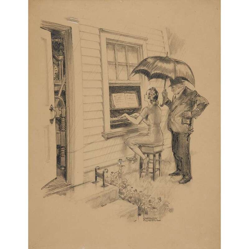Three Women and Radio Man, ca 1926; Young woman playing the piano in the rain under an umbrella, ca. 1940. Each on a heavy paper sheet, approximately 17 x 13 in., (455 x 350mm). Each signed at bottom, small surface wear.