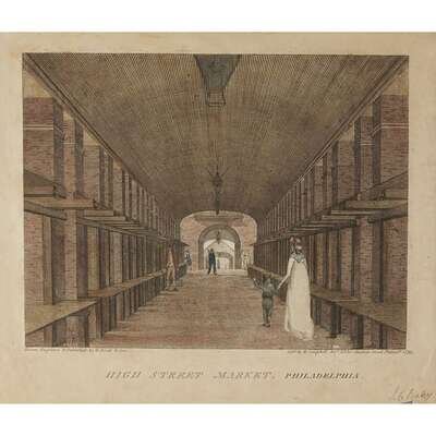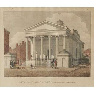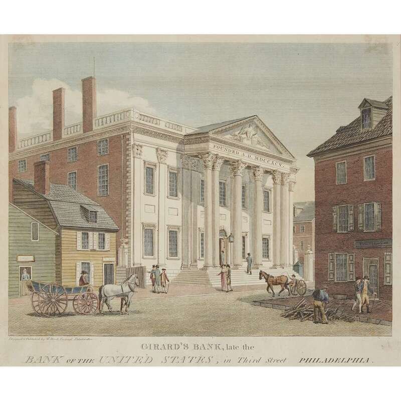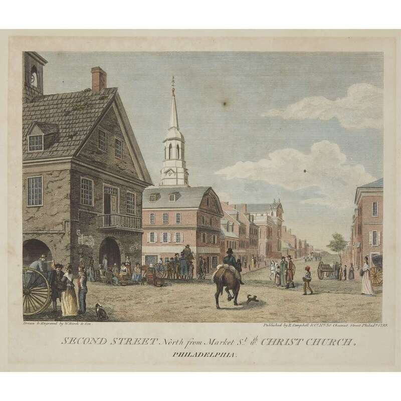 Hand-colored engravings. Includes: 1. Bank of Pennsylvania, South Second Street, Philadelphia. Philadelphia, 1804. From the Second edition. 2. Girard's Bank, late the Bank of the United States, in Third Street, Philadelphia. (Philadelphia), (1828). From the the Third editon. 3. High Street Market, Philadelphia. Philadelphia, 1799. First edition. 4. Jail, in Walnut Street Philadelphia. (Philadelphia), (1804). From the Second edition. 5. Second Street, North from Market St. with Christ Church. Philadelphia. Philadelphia, 1799 [but presumed restrike on heavy paper stock].