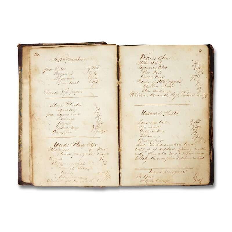 Philadelphia, ca. 1848-1880. 8vo, original half morocco and boards; rubbed, front hinge broken. With approximately 56 pp. of manuscript pharmaceutical recipes, etc., compiled by R. Uhler, Poplar Street, 1848, titled by Uhler in manuscript "Rx Book." Also with 32 pp. of rent receipts, dated Philadelphia and Manayunk, ca. 1860-1880.