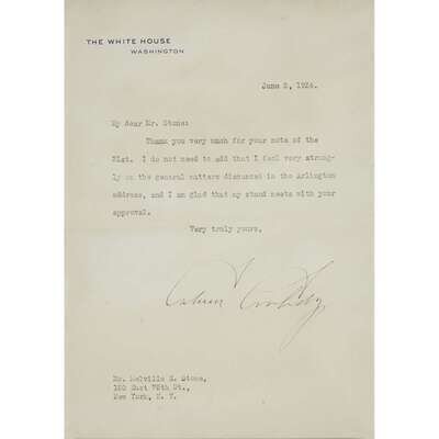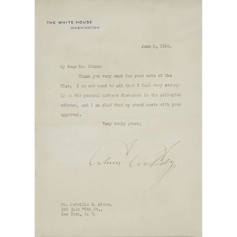 Washington, June 2, 1924. 4to. 1p. To Mr. Melville E. Stone, relating to the Arlington address. Signed as President on White House letterhead, crease along old fold, some wrinkling, signature faded. Framed with photo bust portrait of Coolidge.