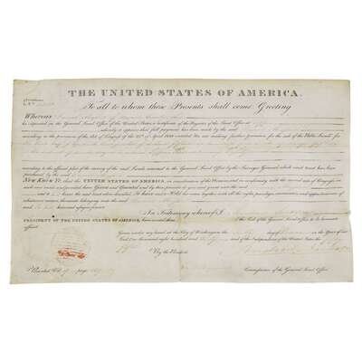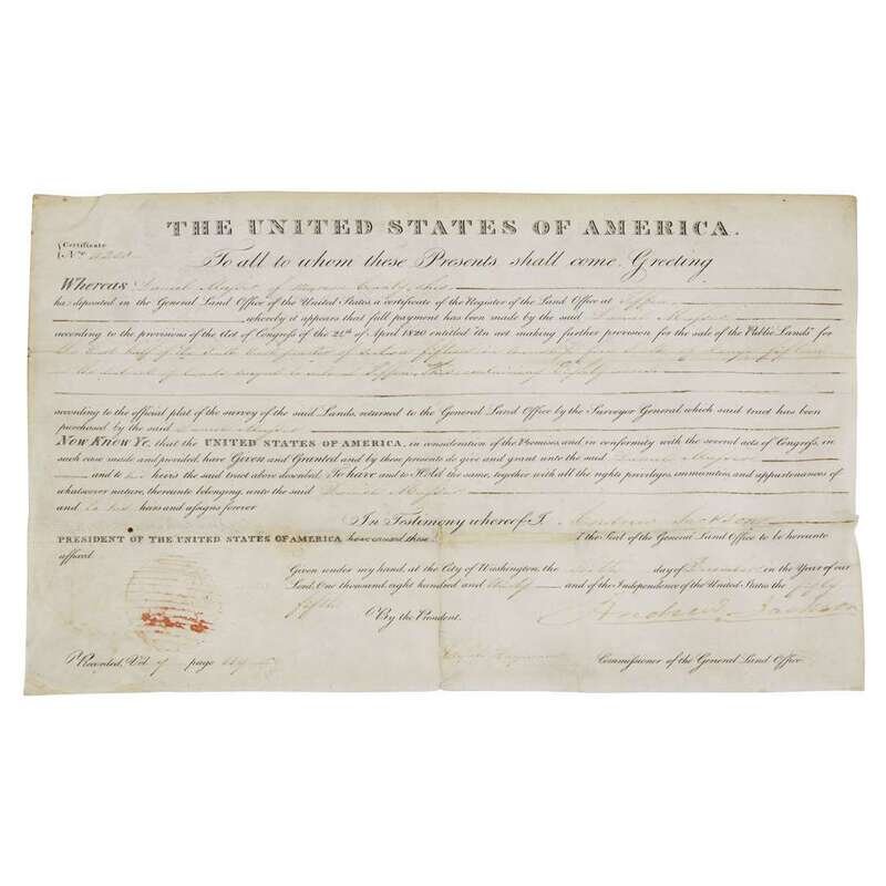 December 9, 1830. 1p. Folio. Land Grant in Merion County, Ohio, signed by Jackson as President and counter-signed by Commissioner of the General Land Office Elijah Haywood. Partially printed document on vellum with manuscript, text and Haywood signature faded, creasing along old folds.