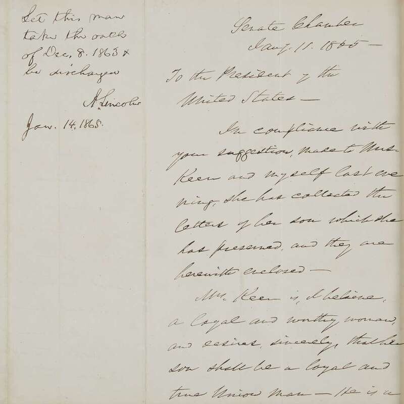 On the second page of a folded 4to sheet, endorsing a manuscript request, on its first page, from the U.S. Senate Chamber, petitioned by the mother of a presumed Confederate soldier to allow her son to be administered the loyalty oath effected by Lincoln's Proclamation of Amnesty and Reconstruction. "Let this man / take the oath / of Dec. 8 1863 & / be discharged / A. Lincoln / January 14 1865."