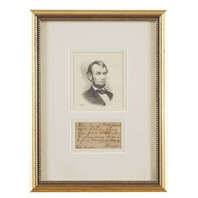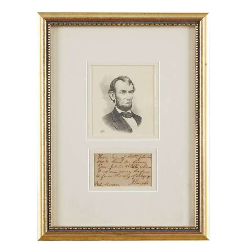 (Washington), Feb. 15, 1865. "Hon. Sec. of State, please / see & hear my friend / Gen. Julius White, whom / I would really be glad / to find this way of obliging." Framed with small format engraved portrait of Lincoln.