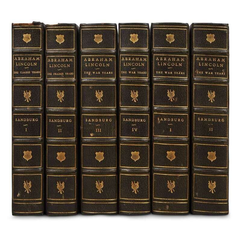 Abraham Lincoln. The Prairie Years New York: Harcourt, Brace & World, Inc., 1926. In two volumes. First edition. 8vo. Three-quarter gilt ruled navy crushed morocco over blue linen, gilt emblem spine with raised bands, marbled endpapers, top edge gilt, by Maurin. Boards lightly discolored, with some minor soiling to edges, light occasional bumping to corners; very lightly toned to margins, otherwise clean and bright. Abraham Lincoln. The War Years New York: Harcourt, Brace & Company, 1939. In four volumes. First edition. 8vo. Three-quarter gilt ruled navy crushed morocco over blue linen, gilt emblem spine with raised bands, marbled endpapers, top edge gilt, by Maurin. Boards lightly discolored, with some minor soiling to edges, light occasional bumping to corners; very lightly toned to margins, otherwise clean and bright. .