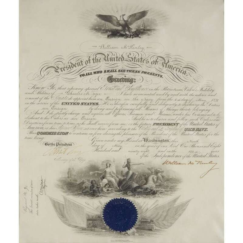 Washington, May 9, 1898. Folio, 17 x 14 in. (435 x 362mm). 1p. Appointing Charle M. Tozer Ensign in the U.S, Navy. Signed by McKinley as President and countersigned by Secretary of the Navy John D. Long. Partially printed document on vellum with filled in manuscript, minor creasing; engraved vignettes; paper seal. Framed with bust portrait of McKinley.