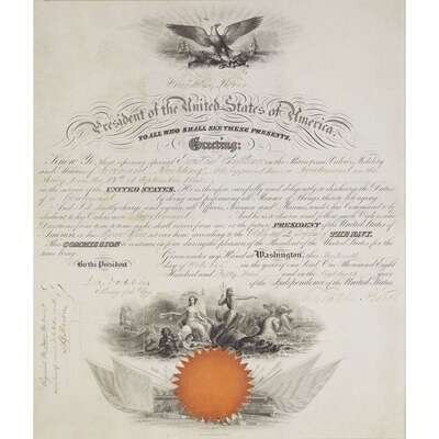 Washington, October 13, 1855. 1p. Folio; 17 x 14 inches, 432 x 371mm. Signed by Pierce as President of the United States appointing Leonard Paulding Lieutenant in the [U.S.] Navy, from September 14, 1855; countersigned by Secretary of the Navy James C. Dobbin. Partly printed document with engraved vignettes, filled in with manuscript, and intact paper seal. On vellum. Pierce's signature strong and clear; lightly creased along old folds, glued to mat but face of document largely clean and unaffected, margins slightly affected.