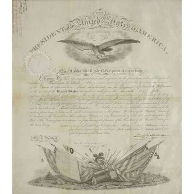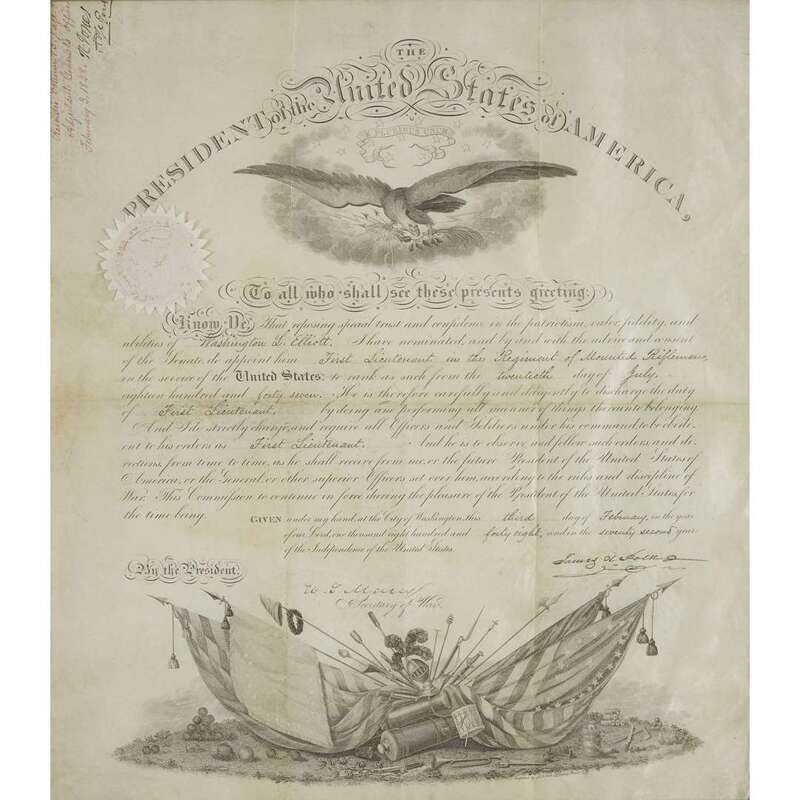 Washington, February 3, 1848. Folio, 16 ¾ x 15 in. (426 x 379mm). 1p. Appointing Washington L(afayette) Elliott First Lieutenant in the Regiment of Mounted Riflemen. Signed by Polk as President and countersigned by Secretary of War William L. Marcy. Partially printed document on vellum, with filled in manuscript, moderately wrinkled; engraved vignettes; paper seal. Framed with bust portrait of Polk. James L. Washington (1825-1886), Civil War Union Brigadier General. .