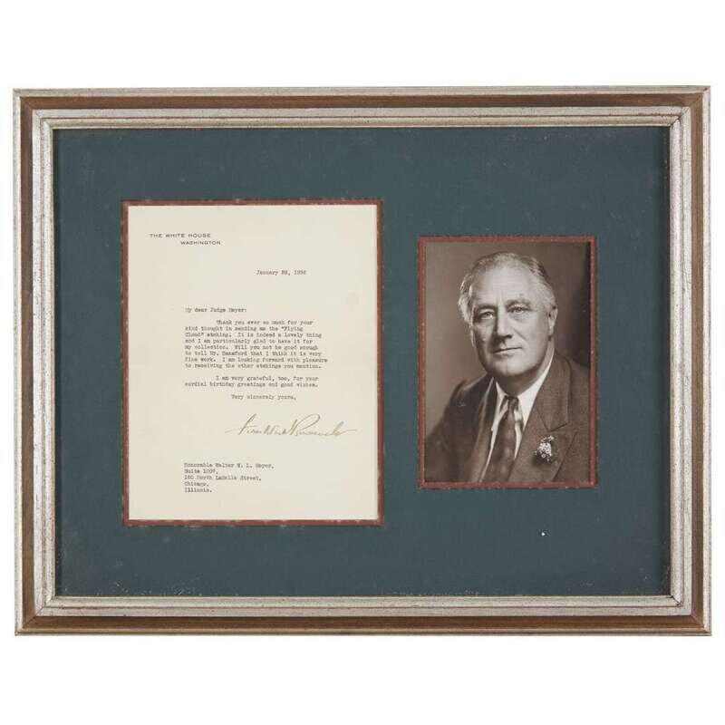 January 28, 1936. 4to. 1p. To Judge Walter W.L. Meyer of Chicago, "Thank you ever so much for thought in sending me the 'Flying Cloud' etching...I am particularly glad to have it for my collection. Will you not be good enough to tell Mr.Dansford that I think it is very fine work...I am very grateful, too, for your cordial birthday greeting and good wishes." Signed by Roosevelt as President on White House letterhead, minor spotting, light browning. Framed with photo bust portrait of Roosevelt.