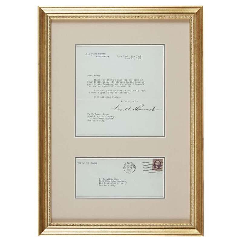 Hyde Park, New York, June 21, 1938. 1 p., 4to. As President of the United States on White House letterhead, to F.W. Lord, "Thank you ever so much got the copy of your little book. It arrived in the closing days of the Congress and therefore I haven't yet had an opportunity to read it..." Framed with typed addressed White House postal cover.