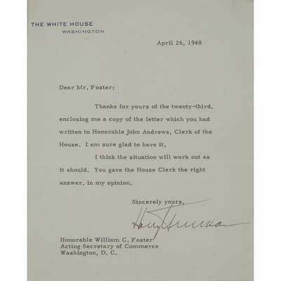 Washington, April 26, 1948. 4to. 1p. To William C. Foster, acting Secretary of Commerce, thanking him for "enclosing me a copy of the letter which you had written to Honorable John Andrews, Clerk of the House..." Signed as President on White House letterhead. Framed with photo bust portrait of Truman.