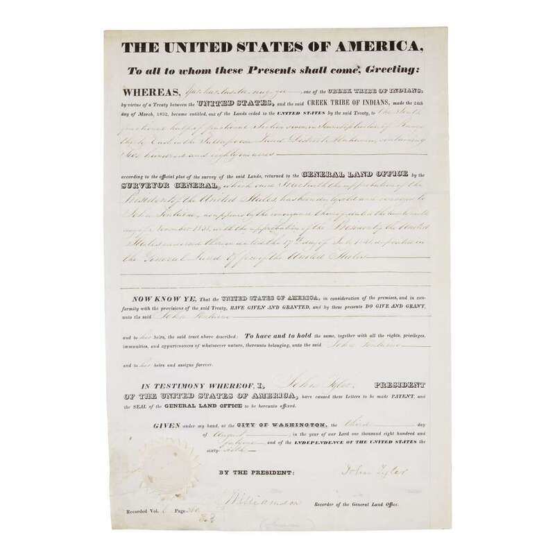 Washington, August 3, 1841. Folio sheet, 17 ¼ x 11 ¾ in. (440 x 293mm). Land grant. Partially printed on vellum with manuscript filled in; intact paper seal. Land grant for John Fontaine for 280 acres in Alabama for land formerly belonging to Yar-har-tus-tee-nug-gee of the Creek Nation that had been ceded to the United States in an 1832 treaty. .