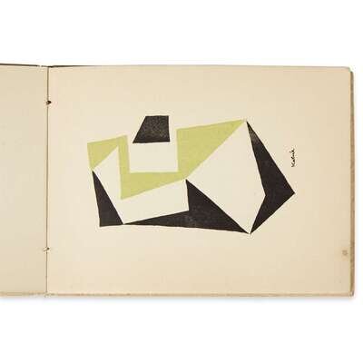 No place: The Divers Press (Palma de Mallorca: Mossen Alcover), 1954. Oblong 24mo; 5 x 6 inches, 125 x 161mm. With four hand set color illustrations by Kitasono. Original cream crepe wrappers printed in red and black over flexible boards. Minor spotting to wrappers; sewn text block separated from wrappers, light foxing to front and rear blank, text and illustrations lightly toned.
