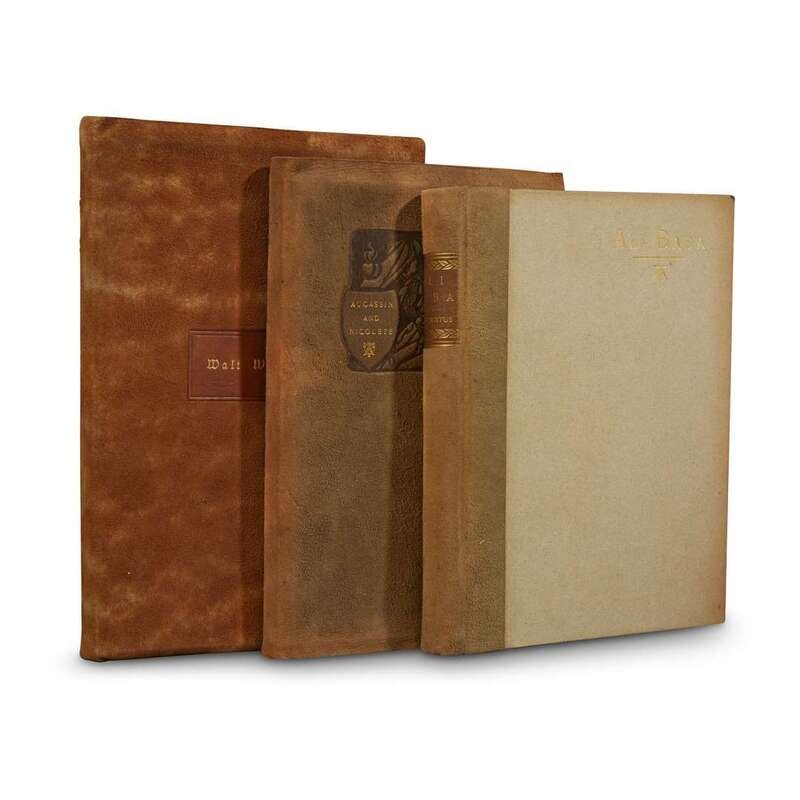 (Hubbard, Elbert) Ali Baba of East Aurora (East Aurora), (1899). First edition, #563/620 numbered copies signed with by Ali X Baba and the illuminator Anna MacMillan. Square 8vo. Illustrated with photo frontispiece and hand Illuminated initials. Original quarter green suede over boards; lettered in gilt; brown morocco spine label, partially unopened, spine sunned. McKenna 33. (Hubbard, Elbert) Aucassin and Nicolette East Aurora, 1899. First edition, [1/950] copies. 8vo. Illustrated with hand-colored and printed initials. Original green suede; stamped in blind and in gilt, partially unopened, spine faded. McKenna 35. Stevenson, Robert Louis The Essay on Walt Whitman (East Aurora), (1900). First edition. 8vo. Illustrated with frontispiece portrait of Whitman and hand illuminated initials. Original brown suede; stamped in blind and in gilt, lightly worn. McKenna 65. .