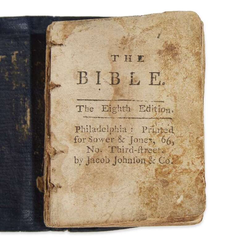 Philadelphia: for Sower & Jones by Jacob Johnson, (ca. 1794-1796). "The Eighth Edition." 64mo. Later oil cloth, text block starting. Illustrated with nine full-page woodcut illustrations, woodcut frontispiece lacking. With the dedication to George Washington. Scattered damp staining. Evans 26649; see Rosenbach 232 for the " Ninth Edition," 1798.