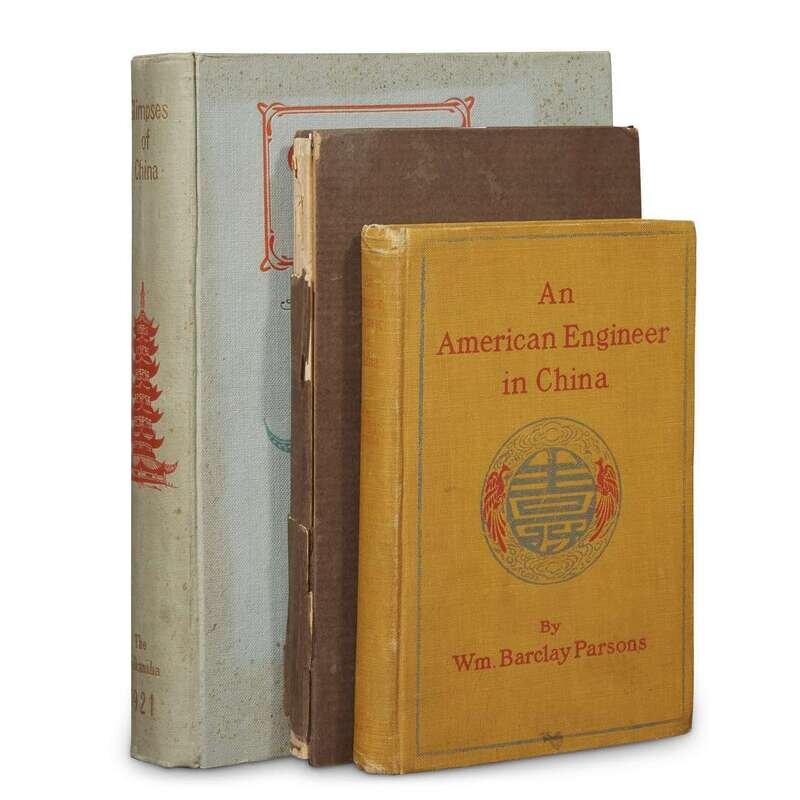 Parsons, Wm. Barclay An American Engineer in China New York: McClure, Phillips, 1900. First edition. 12mo, original red & blue stamped mustard cloth, fore & bottom edges untrimmed; occasionally scuffed, a little dusty. Full -page & text 1/2 tone illustrations. Lacking the folding map. Internally clean. Kawata, T., The Taikansha (editor) Glimpses of China, 1921 Tokyo, [ca. 1921]. Series of the “World Trade Records.” 4to. Illustrated with several half-tone photo illustrations and color ads. Publisher’s green pictorial cloth, lightly worn and spotted; stamped in red and dark green, and in gilt. Title-page toned. Duncan, Robert Moore Peiping Municipality and the Diplomatic Quarter (Tientsin-Peiping), 1933. 8vo. Publisher’s printed tan boards; spine defective. Illustrated with three foldin.