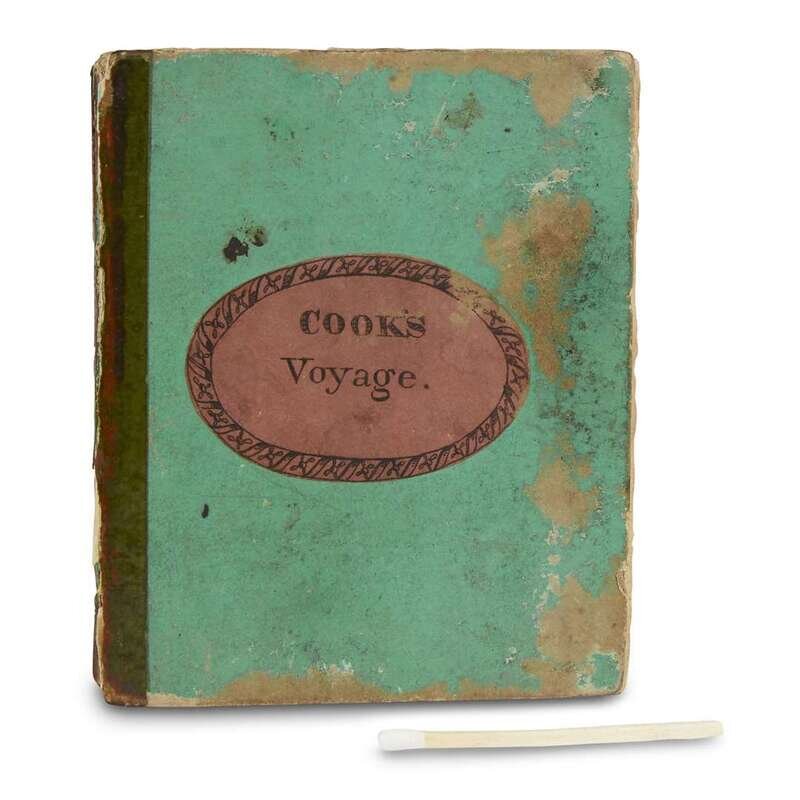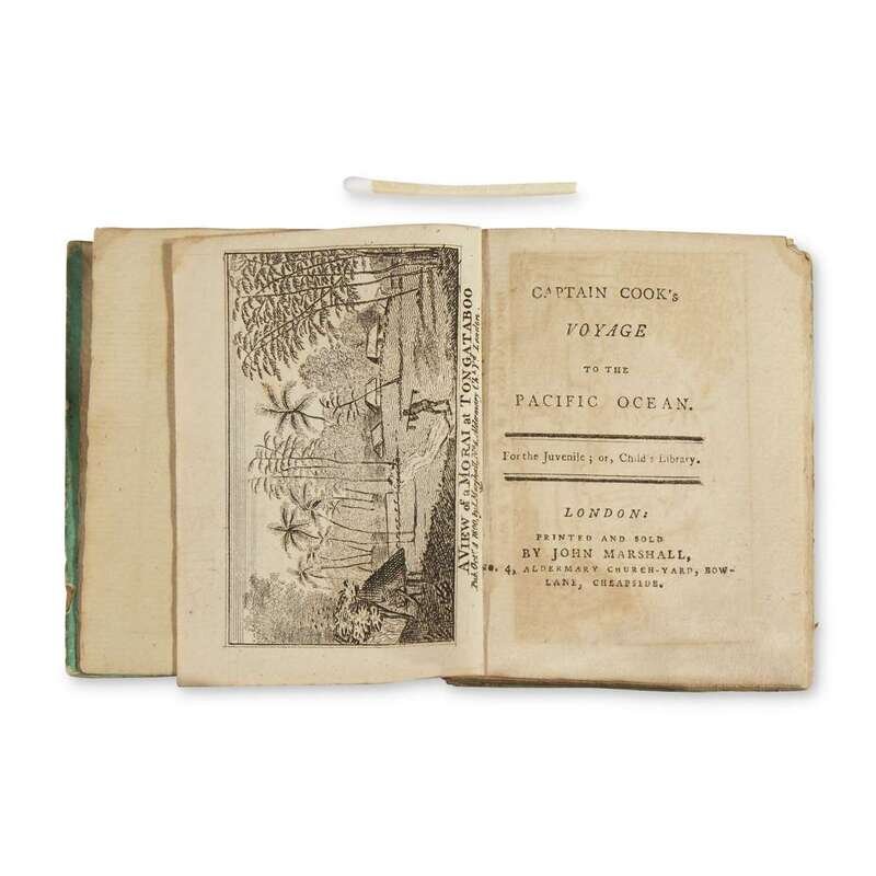 London: John Marshall, (ca. 1800). First and only edition. Square 48mo. 60pp. Illustrated with engraved frontispiece and five engraved plates. Original green boards, worn and soiled, front board detached, rear board starting. Cute volume of Cook’s voyages.