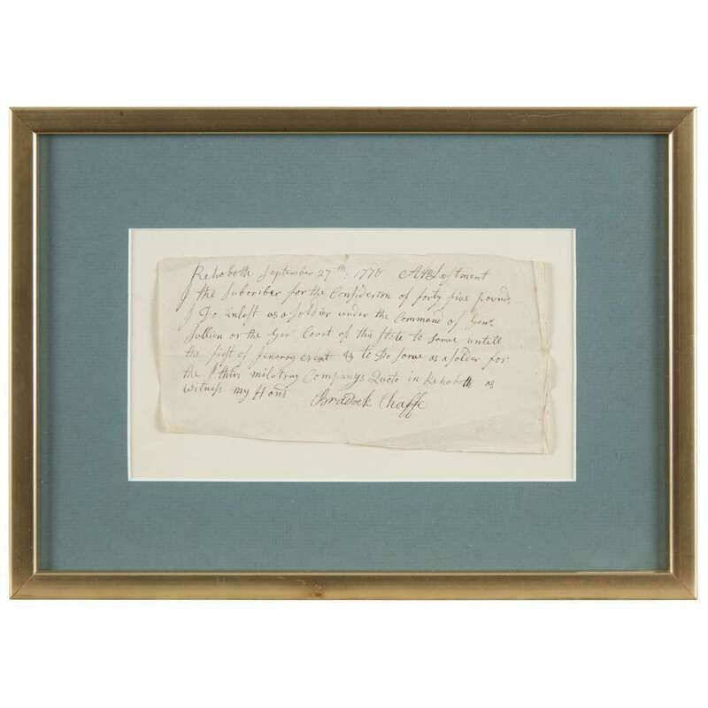 Reid, George. Manuscript document, signed. [Philadelphia?], Dec. 14, 17776. Recording supplies of powder sent to French Creek "for the Congress." Chaffee, Braddock. Manuscript document, signed. Rehoboth, September 27, 1778. Military enlistment attestation.