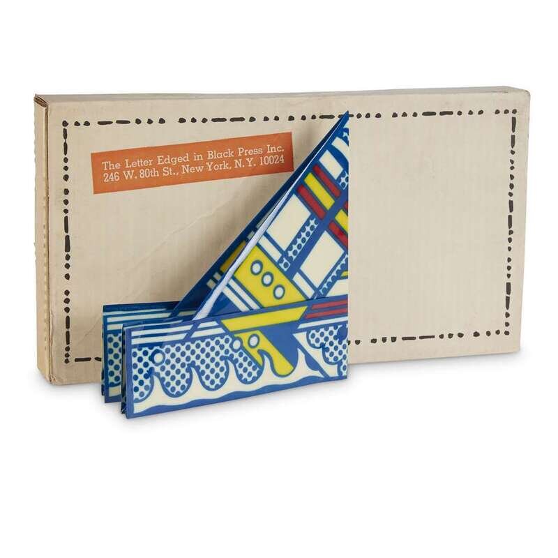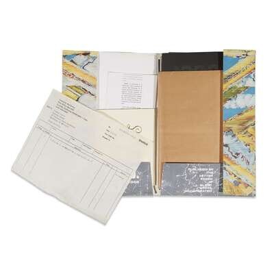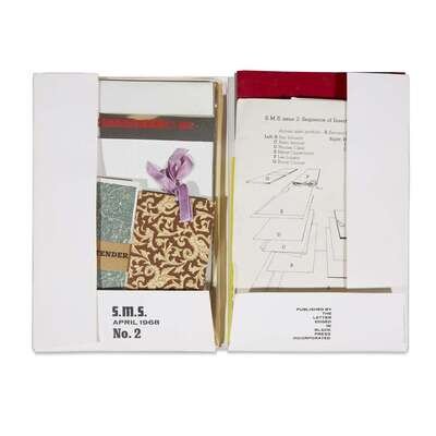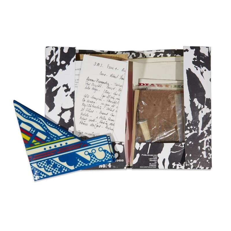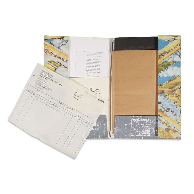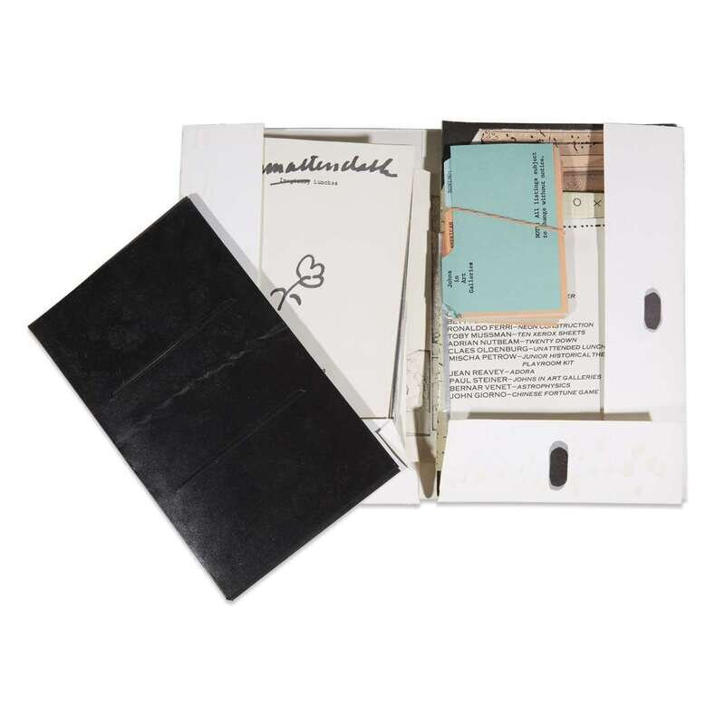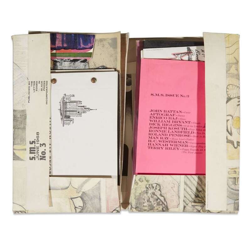 New York: The Letter Edged in Black Press, February-December, 1968. Six boxes. Limited edition, unnumbered of 2000. Approximately 70 pieces of various mixed media and objects housed in original artist designed portfolios and original shipping boxes. Artist index in Issue three, signed by Dick Higgins. All boxes and portfolios opened. Boxes toned, scattered staining, and with some notational markings; objects and portfolios variously worn, some creased and soiled, but overall a well preserved set. Near-complete, but lacking the Terry Riley box and tape with issue three. The Artist Publisher p. 22, SMS Reinhold-Brown Gallery. Two publications relating to the portfolios included: S.M.S: A Collection of Multiples from Reinhold-Brown Gallery, (1988) and The Artist Publisher from Crafts Council Gallery, 1986. Portfolio 1: No. 1, February, 1968. Artists included: Su Braden, James [Lee] Byars, Christo, Walter de Maria, Richard Hamilton, Julien Levy, Kasper Konig, Sol Mednick, Irving Petlin (cover), Nanc Reitkopf, La Monte Young and Marian Zazeela. Portfolio 2: No. 2, April, 1968. Artists included: Nicolas Calas, Bruce Conner, Marcel Duchamp (cover), Marcia Herscovitz, Alain Jacquet, Ray Johnson, Lee Lozano, Meret Oppenheim, Bernard Pfriem, George Reavey, and Clovis Trouille. Portfolio 3: No. 3, June, 1968. Artists included: John Battan (cover), Aftograf, William Bryant, Dick Higgins (signed), Joseph Kosuth, Ronnie Landfield, Roland Penrose, Man Ray, H.C. Westerman, and Hannah Wiener. Lacking Terry Riley box and tape. Portfolio 4: No. 4, August, 1968. Artists included: Paul Bergtold, John Cage, Arman Fernandez, Hollis Frampton, On Kawara, Roy Lichtenstein, Lil Picard, Robert Stanley (cover), Rotella, Robert Watts, and Princess Winifred. Portfolio 5: No. 5, October, 1968. Artist included: Congo (chimpanzee, cover), William Anthony, Wall Betterton, Edward Fitzgerald, Neil Jenny, Angus MacLise, Bruce Nauman, Mel Ramos, Robert Rohm, William Schwelder, Diane Wakoski, Larry Wiener, Yoko Ono, and William Copley. Portfolio 6: No. 6, December, 1968. Artists included: Richard Artschwager (cover), Ed Bereal, Diter Rot, Betty Dodson, Ronaldo Ferri, Toby Mussman, Adrian Nutbeam, Claes Oldenburg, Mischa Petrow, Jean Reavey, Paul Steiner, Bernar Venet, and John Giorno.