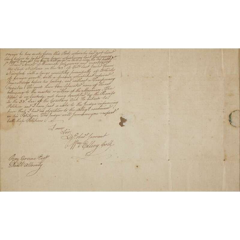 Newport [Rhode Island], November 12, 1796. 2pp. 4to. With integral address leaf. Signed as Customs Collector of the Port of Newport to Ray Greene [as Attorney General of Rhode Island], "A libel has been drawn agst the Ship Betsy..." signed, "Wm. Ellery." Lightly toned, small paper wound from excision of seal, but not affecting manuscript, lightly creased, a few negligible paper separations, light horizontal crease traversing signature, light vertical crease touching the signature's first letter. Framed. .