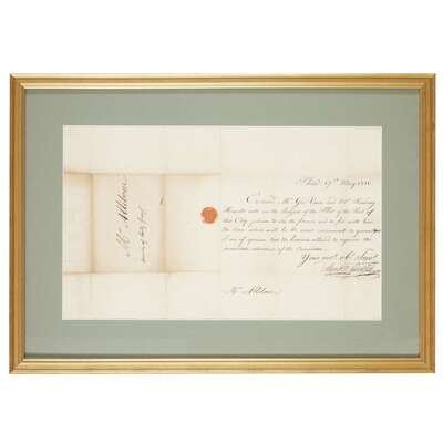 Philadelphia, May 27, 1811. 1p. 4to. To Mr. Allibone, "Enclosed Mr. Geo. Vaux and Mr. Reading Howells note on the subject of the Plot of the Port of this city..." Framed with engraved portrait of Girard.