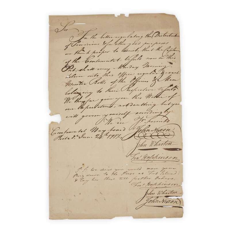 Philadelphia, June 24, 1777. 1p. Folio. To John Ashmead, Commander on Board [the Continental Brig] The 'Mercury,' indicating the procedures to be followed by Captains of Continental Vessels in the distribution of provisions to their command. Signed by Hopkinson as Chairman of the Continental Navy Board, and counter signed by John Nixon and John Wharton. Addressed on verso to John Ashmead (as above) with Hopkinson's autograph postscript, "We desire you would move your Brig down to the [?] at Fort Island & lay her there till further orders."