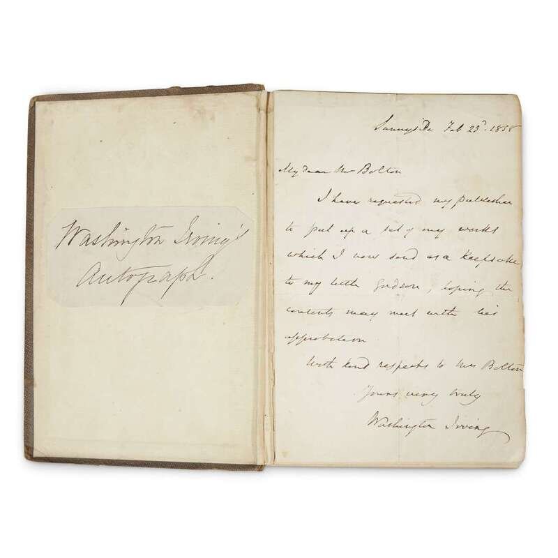 New York: G.P. Putnam & Co., 1857. Reprint. 8vo. 454 pp. Volume one only. Autograph letter, signed by Irving and dated Feb. 23, 1858 to a Mr. Bolton, "I have requested my publisher to put up a set of my works which I will send as a keepsake to my little godson; hoping its contents may meet with his approbation…yours very truly, Washington Irving," tipped in at front. Original grey cloth, covers worn, joints worn, tear to spine, corners bumped; facsimile Irving signature in ink on mounted paper on front paste-down, text lightly toned, occasional foxing to same.