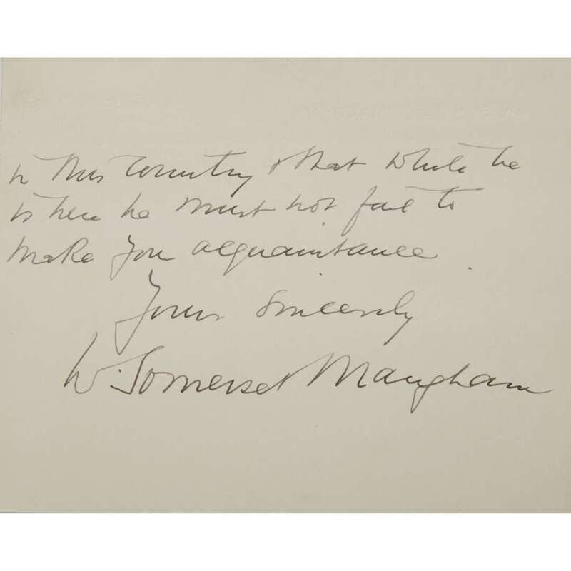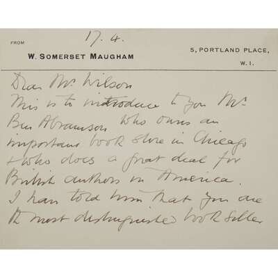 (London), April 17, [ca. 1941-1959]. 2pp. 4x4 7/8 inches (100 x 124mm). To (John Gideon) Wilson of Bumpus booksellers in London, introducing Ben Abramson “who owns an important book store in Chicago who does a great deal for British authors in America...” On Maugham’s letterhead card stock in an envelope addressed in his hand.
