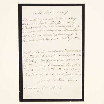 Fair copy of his poem "Away", first published in his collection, Afterwhiles, Indianapolis: Bowen-Merrill, 1887. 6 7/8 x 4 7/8 inches. Mourning stationery; single-fold. This copy is composed of 12 lines in two stanzas while the published copy is in 24 lines in 12 stanzas (the additional lines start at "And loyal still…" and end at "…wet with rain.- "). He's just away. I cannot say-and I will not say That he is dead-He's just away With a cheery smile and a wave of the hand He has wandered away to an unknown land And left us dreaming, how very fair It needs must be-since he lingers there And you, O, you who the wildest mourn For the old time step and the glad return Think of him faring on, as dear In the love of There-as the love of Here Think of him still the same I say, He is not dead-he is just away. James Whitcomb Riley. Thursday, June 9-04. .