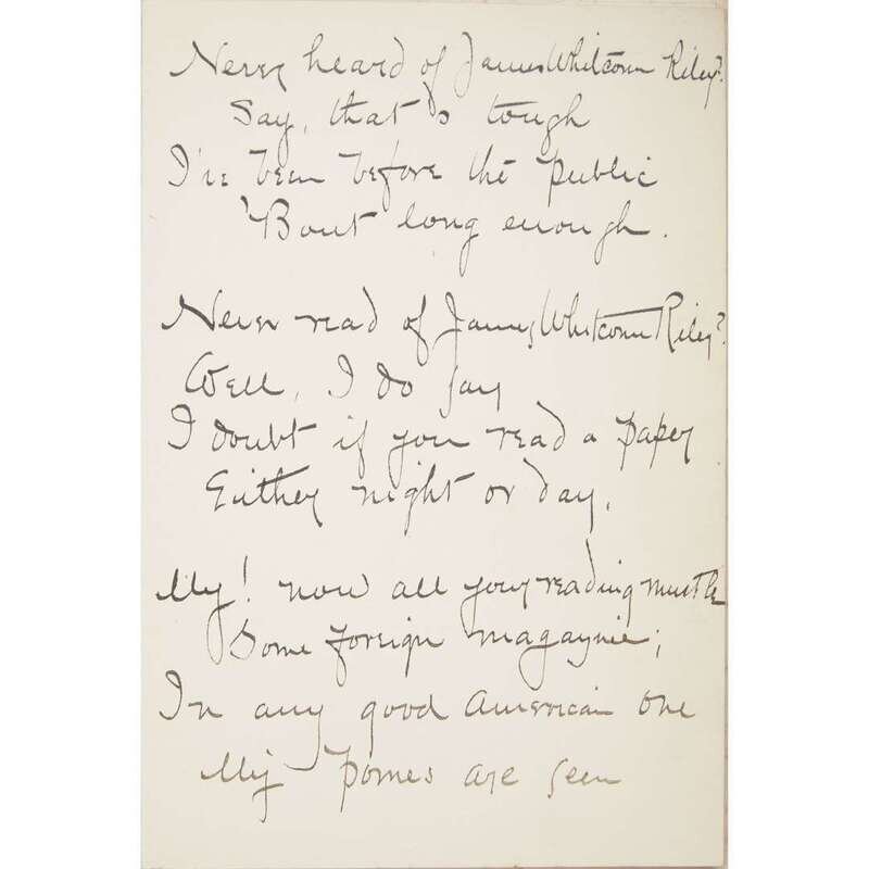 Indianapolis: The Bowen-Merrill Co., 1891. First edition. 12mo. With original James Whitcomb Riley five stanza holograph poem, serving as a humorous presentation of the above volume , on a folded 12mo leaf mounted to front fly leaf. Illustrated with frontispiece portrait. Original gilt-pictorial two-tone cloth, covers warped, corners rubbed, other light wear to extremities; lettered in gilt; top edge gilt; marginal dampstains at rear, text lightly toned. BAL 16572, First state.