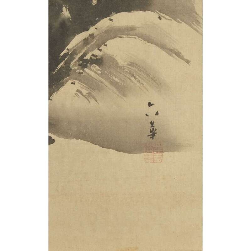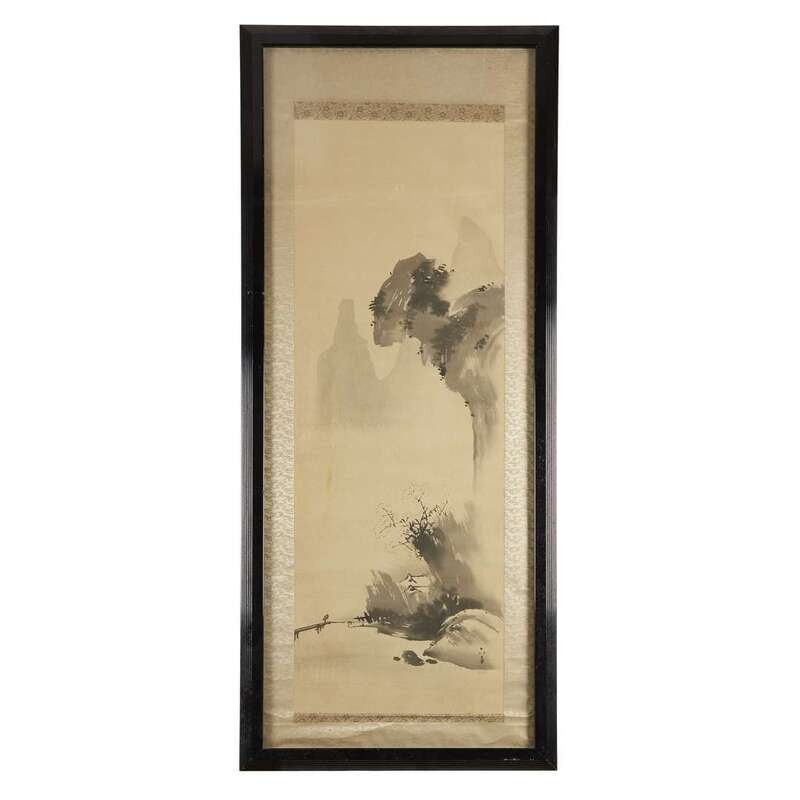 PRUNUS IN MOUNTAINOUS LANDSCAPE WITH TRAVELLER OVER A BRIDGE Ink and light color on silk, inscribed "Rokka" and with seal to lower right, mounted on brocade, framed, matted, and glazed.