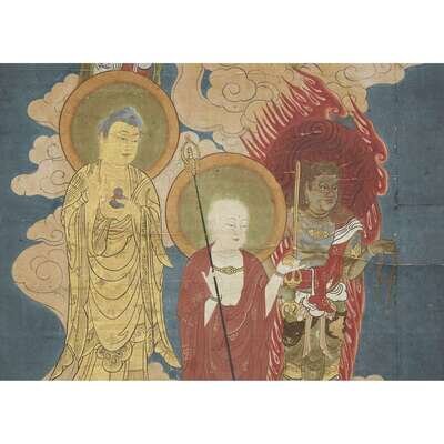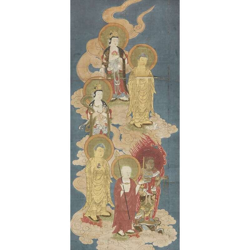 AMIDA RAIGO ink and color on paper, mounted as a hanging scroll, engraved copper roller cap, Japanese wood box.