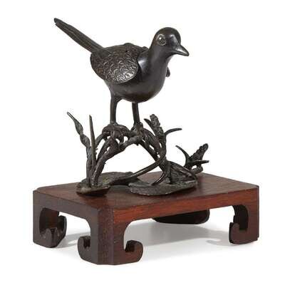 A Japanese red bronze bird-form censer with later wood stand the bronze edo period